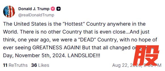 格隆汇8月22日丨美国总统特朗普在社交媒体上发文:“美国是全世界最‘火热’的国家,没有任何其他国家能接近。想想看,一年前我们还是一个‘死气沉沉’的国家,毫无重见伟大的希望!但这一切在2024年11月5日选举日那天改变了。压倒性胜利!!!”